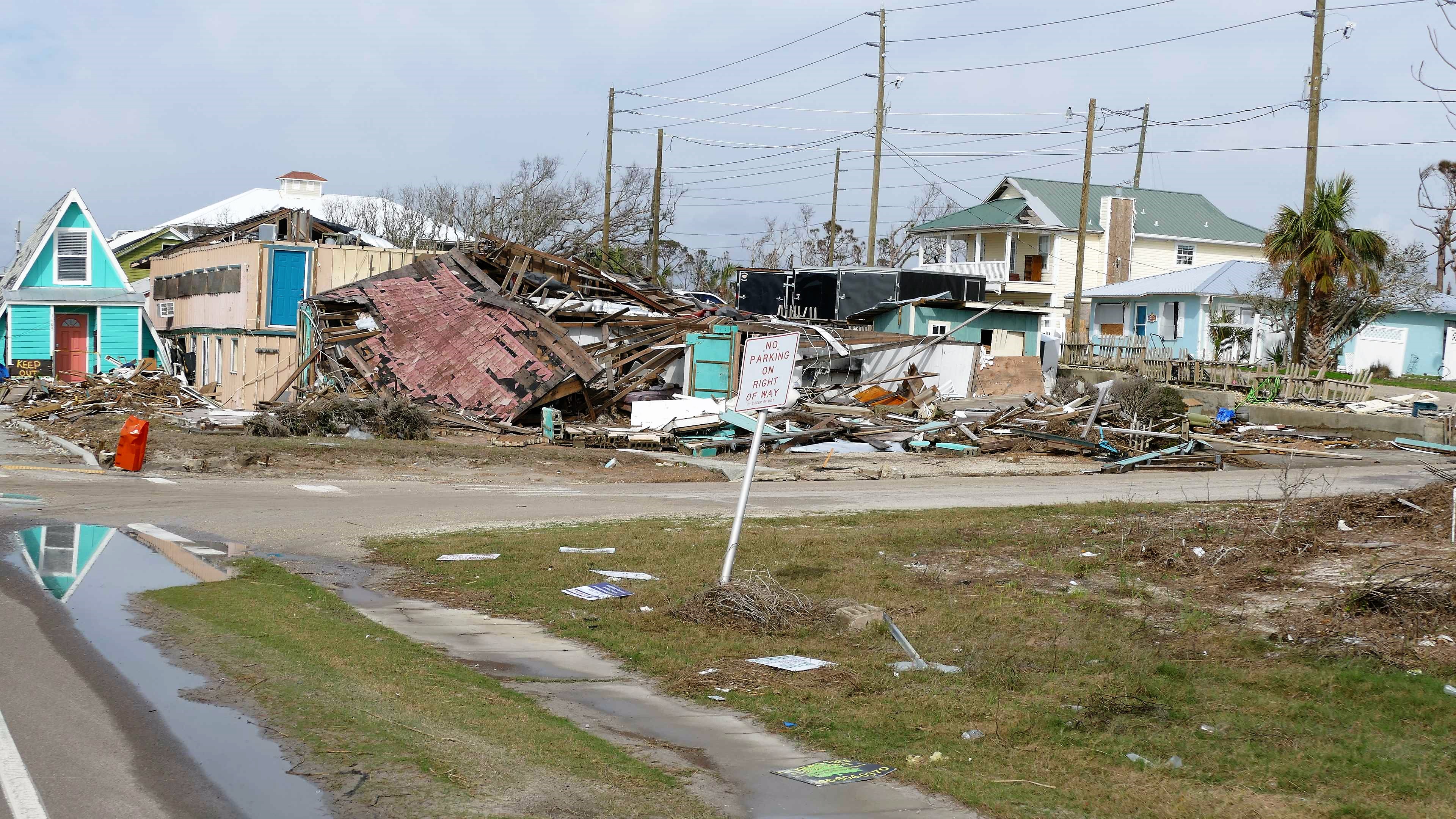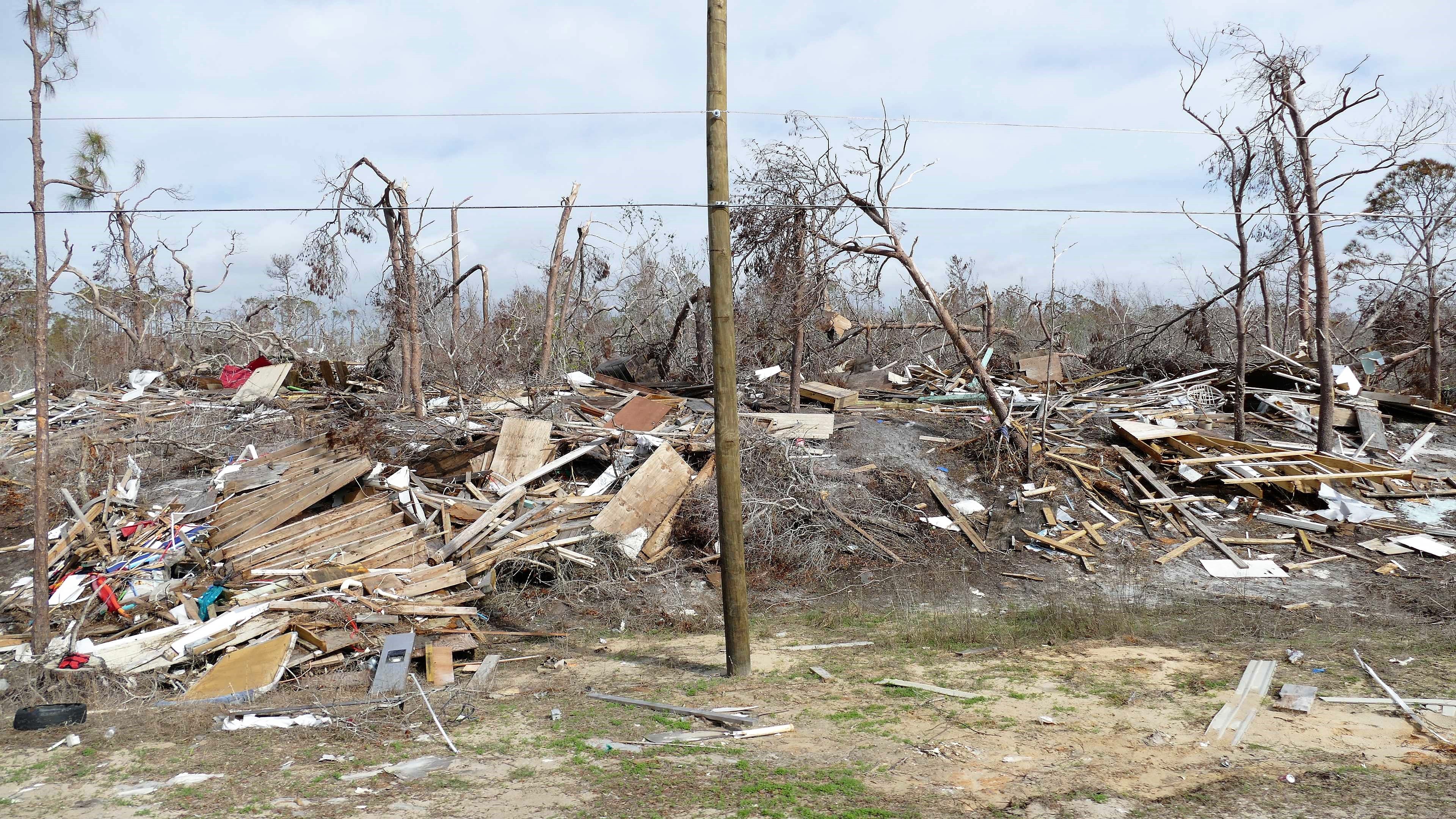 Kaum haben wir die Stadt verlassen, kommen wir ins Hurrikan Katastrophengebiet. Beginnend von Port Saint Joe bis rüber nach Panama City zieht sich der Zerstörungsgürtel. Was man nicht mit eigenen Augen gesehen hat, begreift, erfasst man nicht wirklich. All die Bilder und Berichte im TV oder Internet informieren zwar ausführlich, aber wirklich 'gesehen' hat man das Ausmaß derartiger Katastrophen nicht; all das ist dann immer sehr, sehr weit entfernt. Wir haben den Eindruck, als würden wir ein Kriegsgebiet durchfahren. Oft sind ganze Viertel dem Erdboden gleichgemacht – teils vom Hurrikan oder bereits durch Abbruchunternehmen, während in anderen Abschnitten noch halbe Häuser zum Abriss stehen. Wir fahren kilometerweit durch Wälder, in denen der Großteil der Bäume wie Streichhölzer abgeknickt ist. Es ist echt bedrückend hier durchzufahren und mehr als zwei Monate nach dem Hurrikan noch derart schlimme Verwüstungen zu sehen. Die Straßen an der Küste wurden teilweise unterspült und sind nur notdürftig repariert. Manche nicht so stabil gebauten Strandhäuser wurden einfach weggespült. Bei vielen etwas stabileren Betonhäusern müssen 'nur' die Dächer und Fenster repariert bzw. ersetzt werden. Die State Parks und Campingplätze hier sind belegt mit RVs der ehemaligen Hausbesitzer oder der jetzt dringend benötigten Arbeitskräfte. Das wird noch eine Weile dauern, bis hier wieder Normalzustand eingekehrt ist und sich wieder Touristen einfinden, die an den wirklich schönen Stränden Urlaub machen wollen.