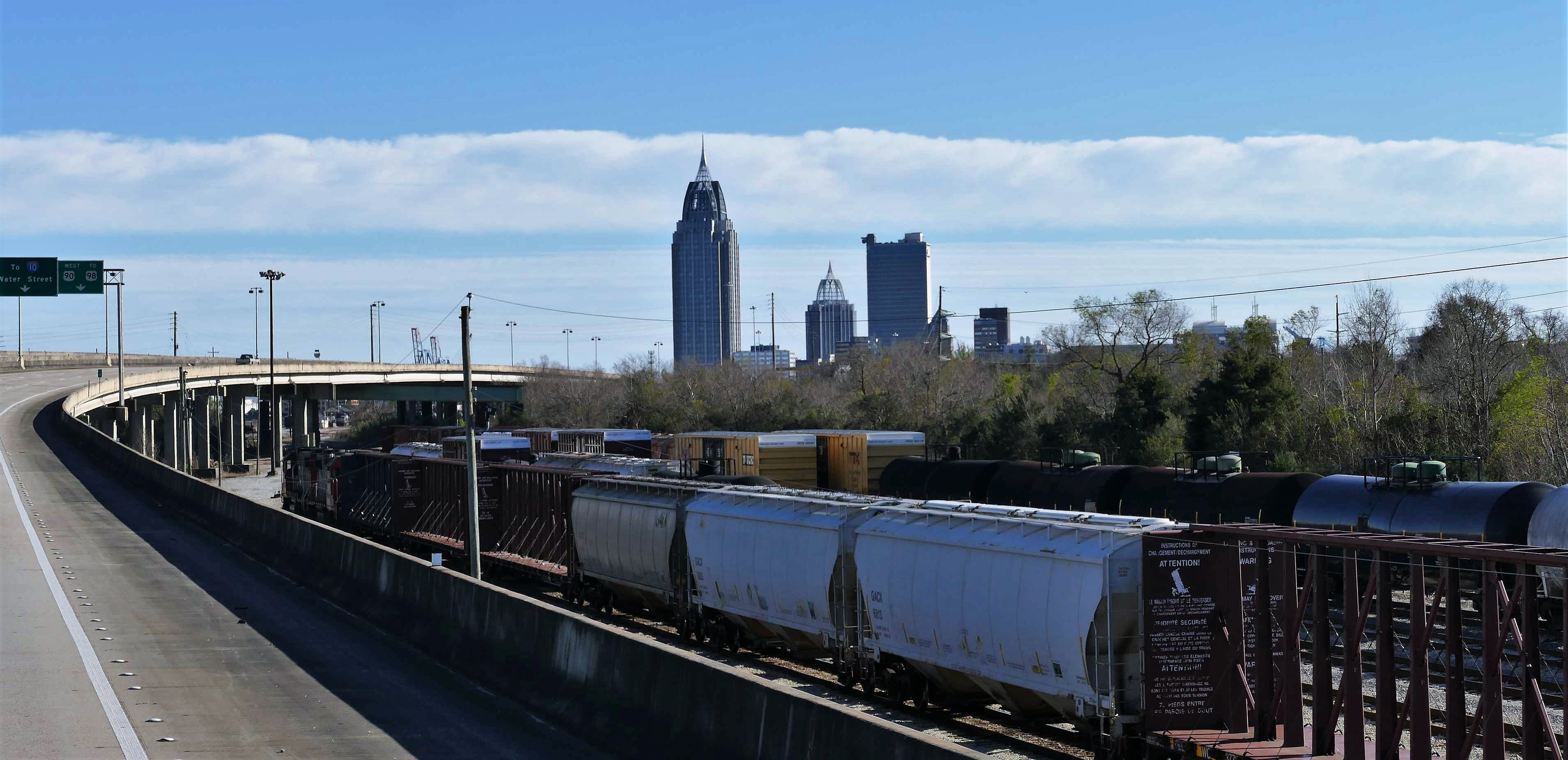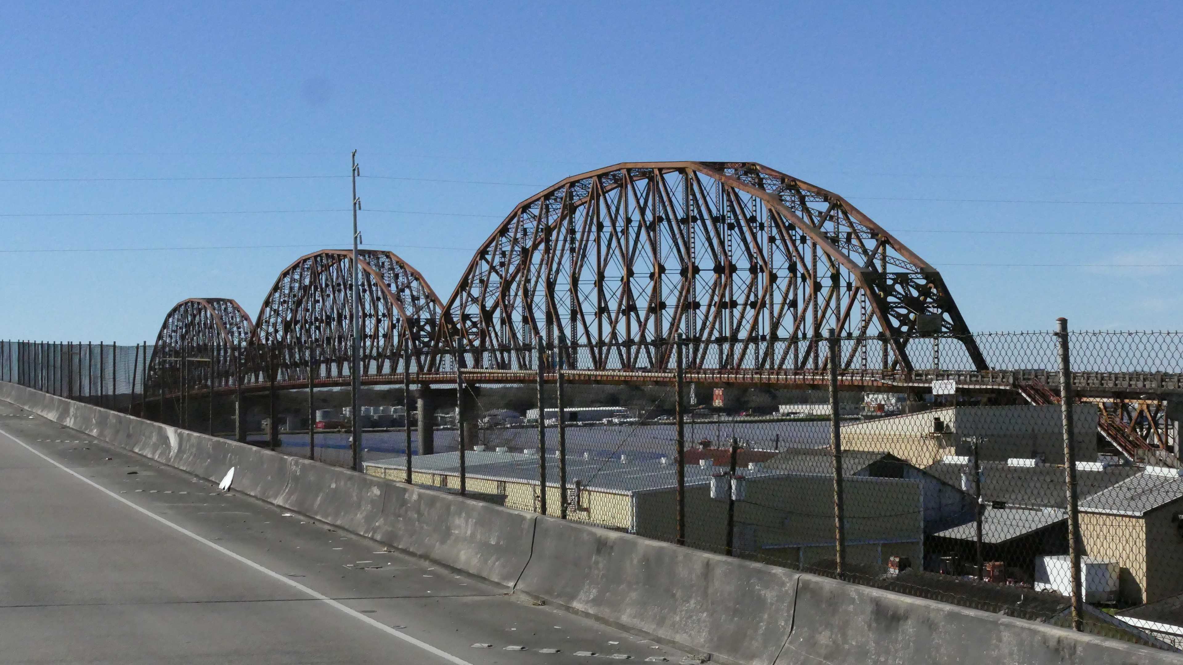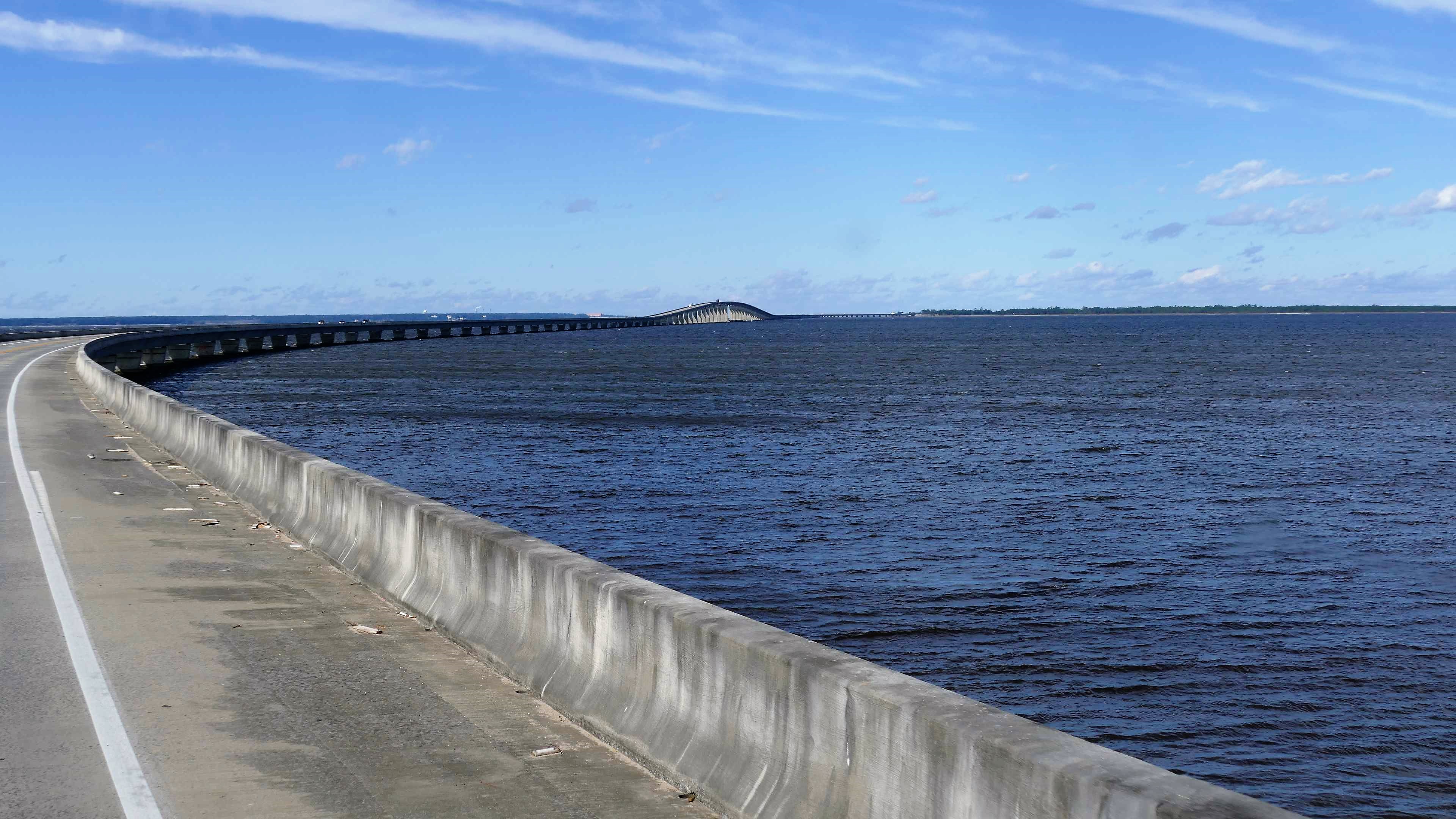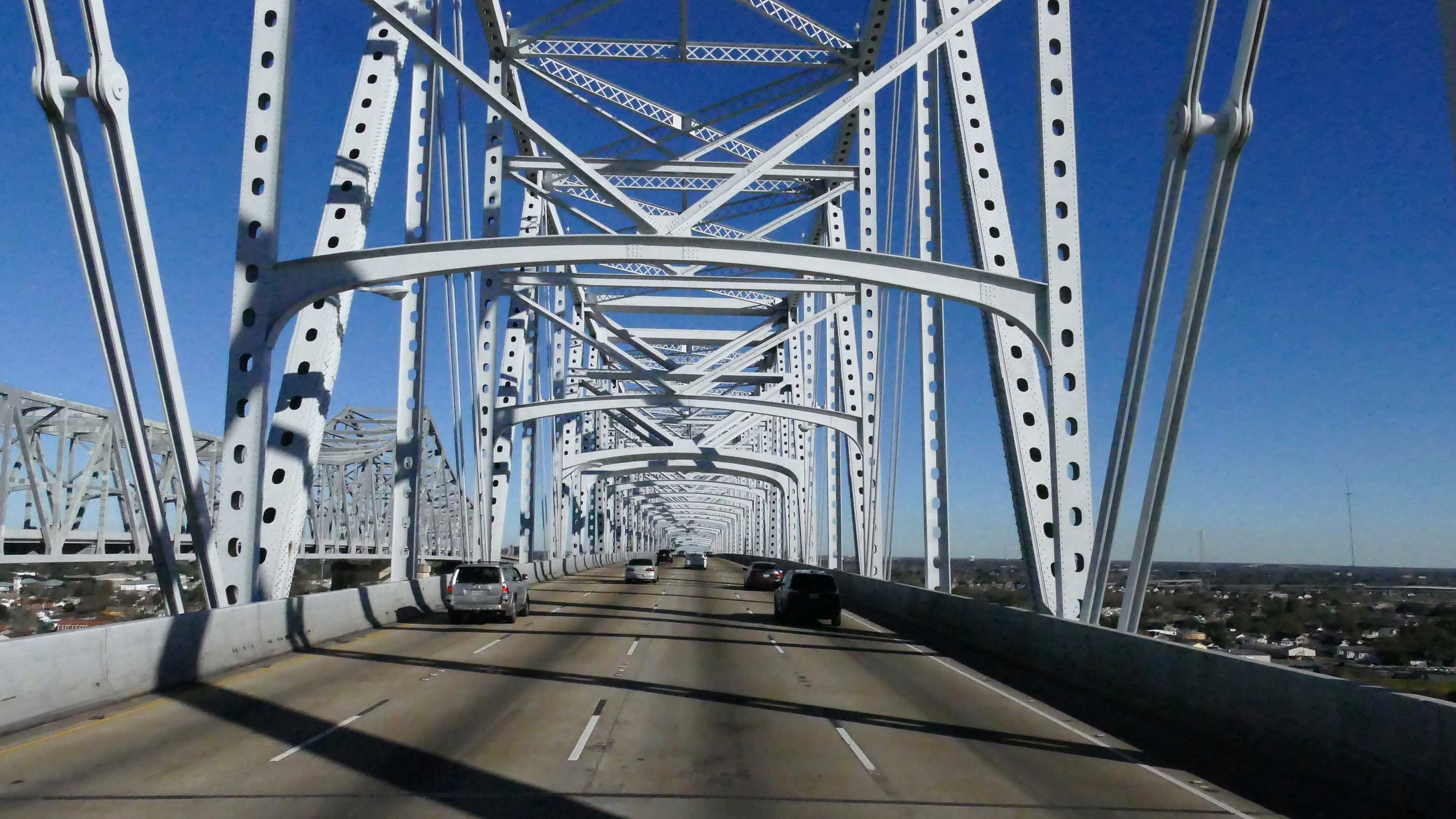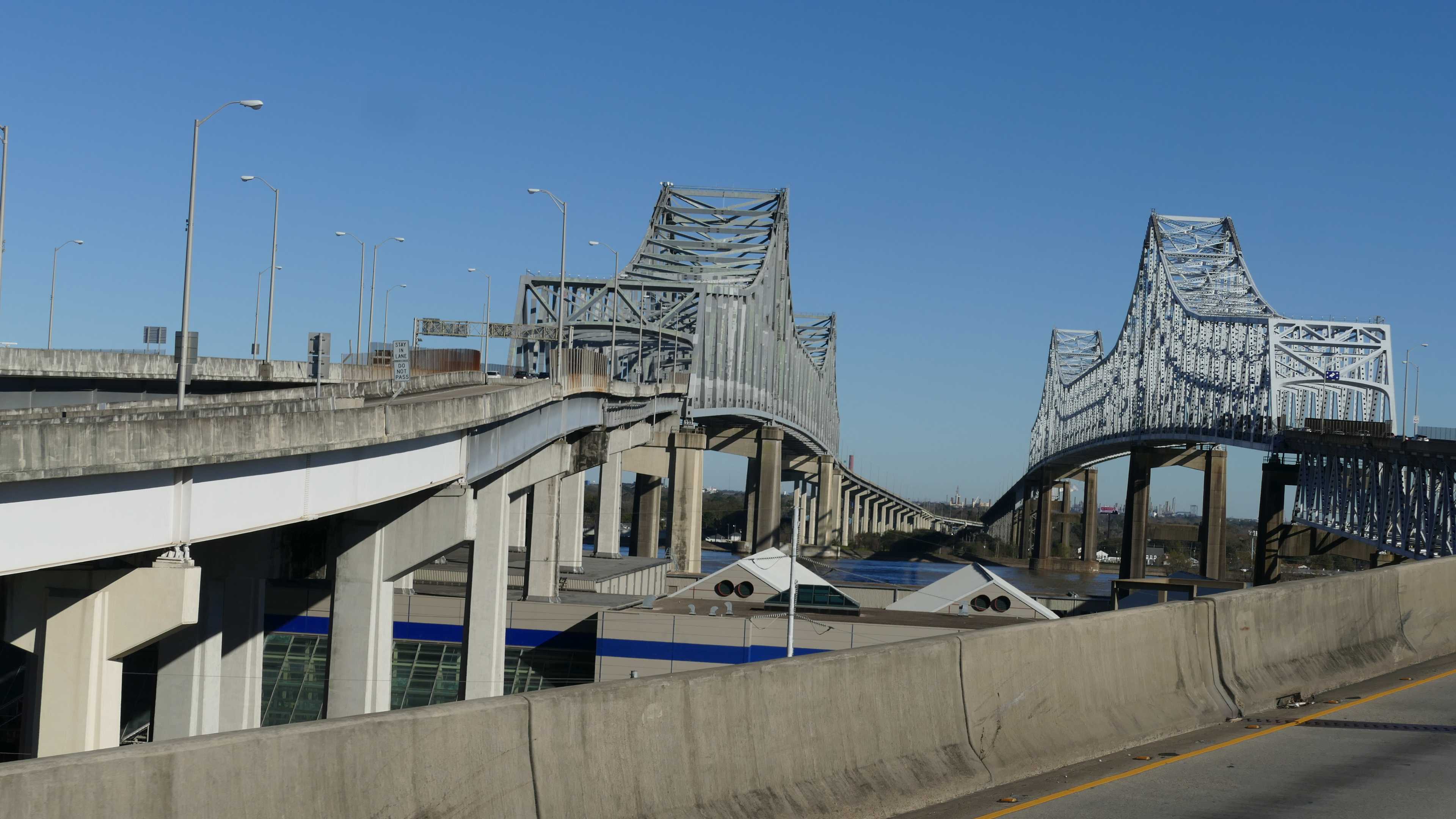 Wir müssen einmal um Mobile herum bzw. es teilweise durchqueren. Im östlichen Teil geht es über eine riesige Hängebrücke, die den Hafen und die Wasserarme im Landesinneren in solcher Höhe überspannt, dass auch bequem große Öltanker drunter durchpassen. Von oben haben wir einen tollen Blick auf die Schubkähne und weitere Brücken mit Abschnitten, die für den Schiffsverkehr geschwenkt oder angehoben werden können.