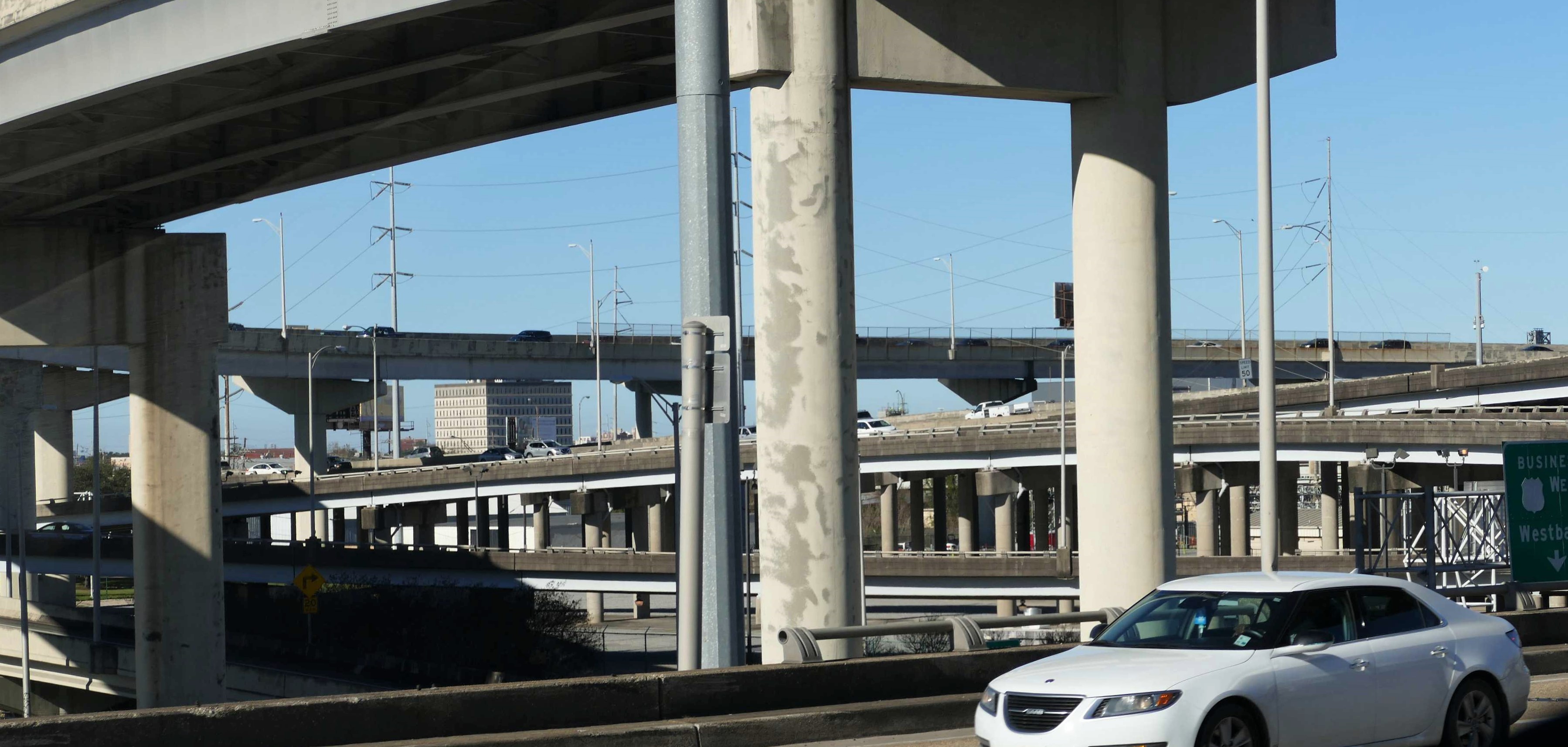 Auf dem Weg dorthin kommen wir nochmal über die Spaghetti-Highway-Kreuzung mit Blick auf das etwas abstrakt aussehende und für 25 Mio.$ gebaute WWII-Memorial und die Superbowl-Arena (Mercedes-Benz).