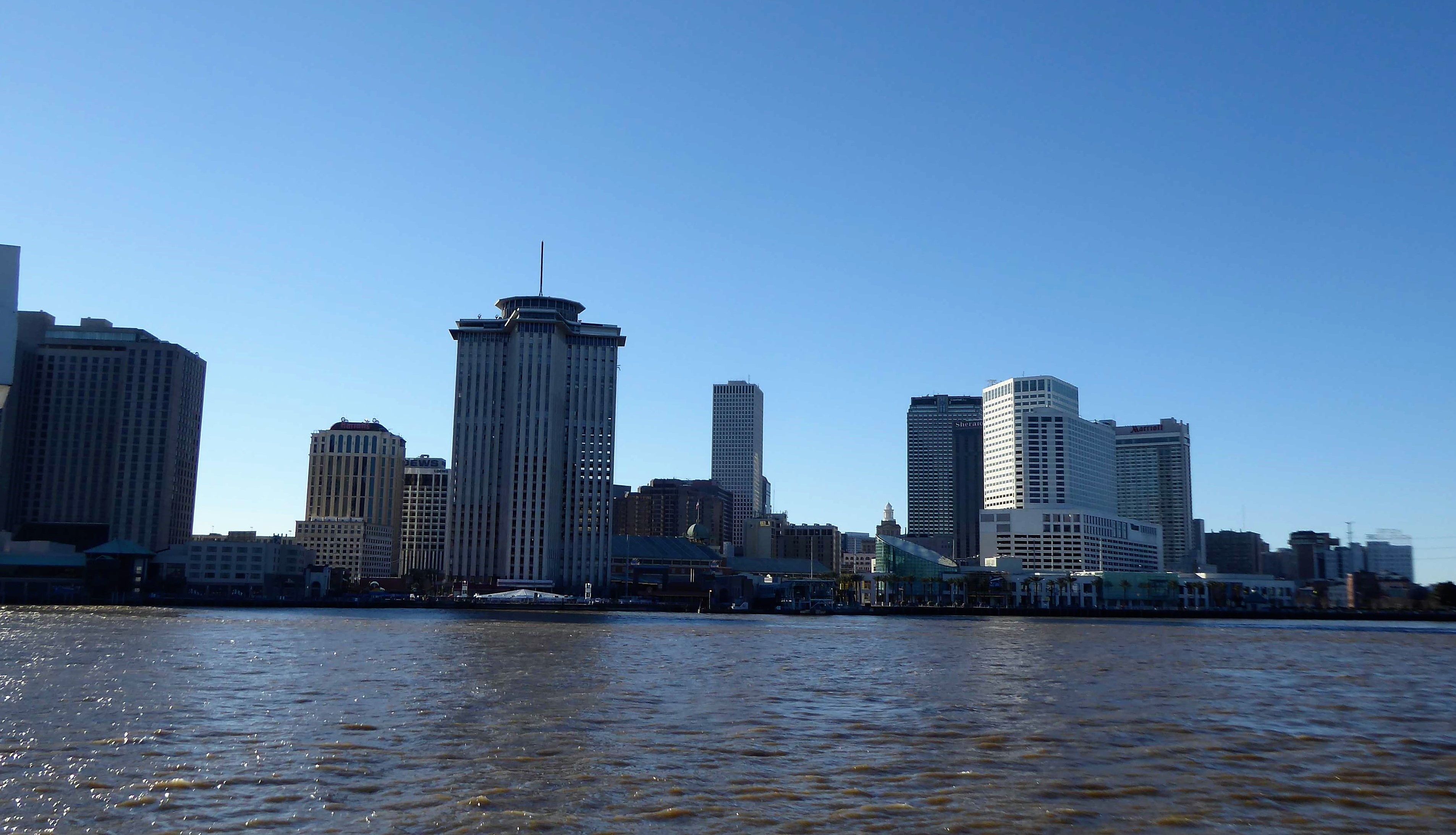 Relativ ruhig geschlafen, bis auf vorbei fahrende Schiffe. Wir wollen noch vor dem Frühstück vom Parkplatz hier an der Fähre in Algiers Point rüber zum 9km entfernten Walmart-Parkplatz, damit wir nicht nochmals 10$ Parkgebühren bezahlen müssen. Vom Walmart aus kommen wir auch super mit den Rädern nach Downtown. Ganz schön frisch heute Morgen, aber die Morgensonne strahlt Downtown schon an. Auch der Schaufelraddampfer Natchez liegt schon bereit für die heutigen Touristenströme. Wir queren wieder den Mississippi über die riesigen Eisenbrücken mit Blick hinunter auf die Kreuzfahrtschiffe und die angeleinten Lastkähne.