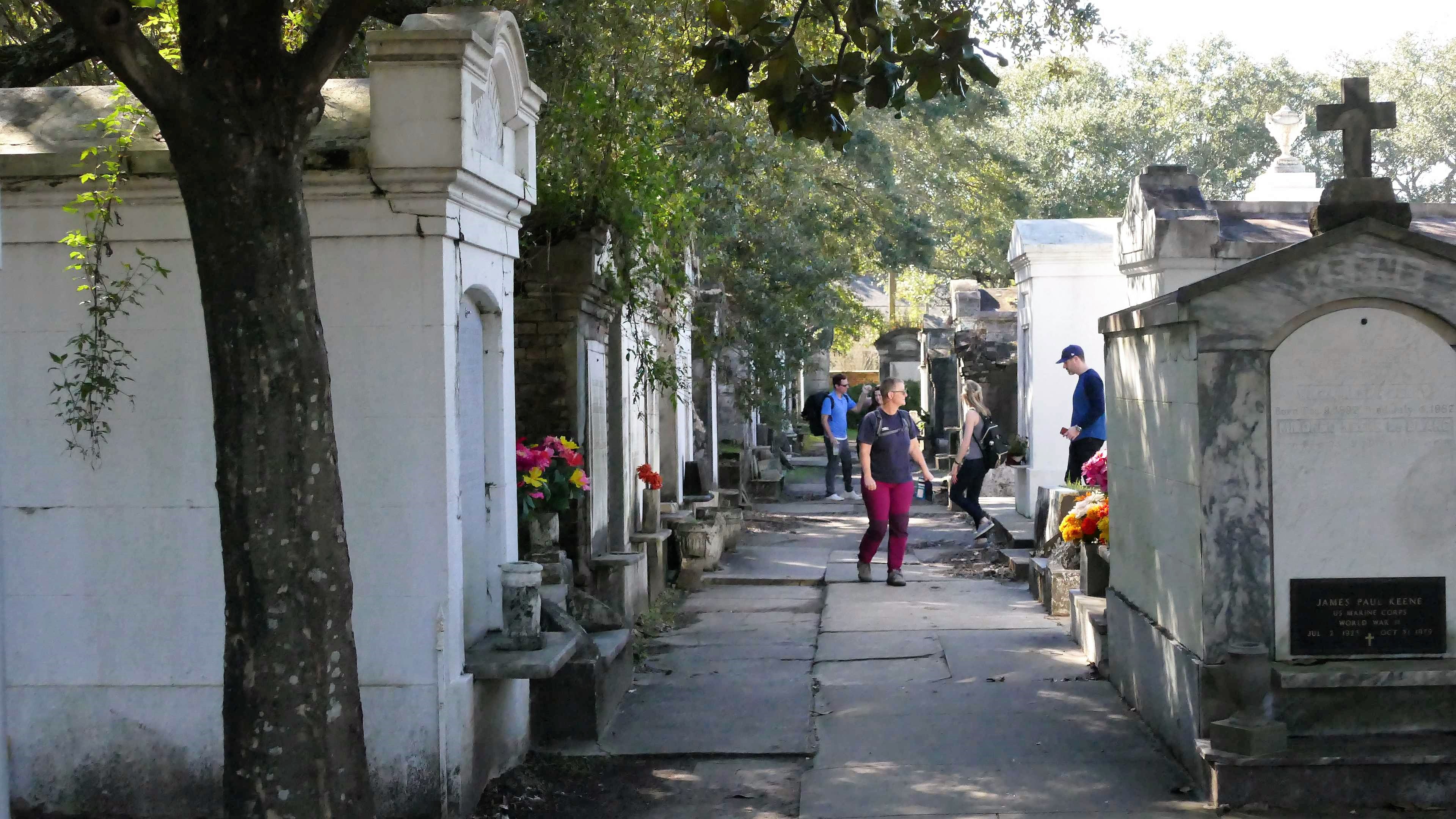 Mitten im Garden District liegt ein Highlight von N'Awlins, der Lafayette Cemetery #1. Auf diesem Friedhof dürfen Filmemacher drehen, wenn sie Aufnahmen von einem Friedhof in New Orleans bzw. einem typischen Südstaaten-Friedhof haben möchten, wie z.B. „Interview mit einem Vampir“ (USA 1994). Es gibt selbstverständlich noch viele andere Friedhöfe, dort darf allerdings nicht gedreht werden und teilweise sind sie für die Öffentlichkeit nicht zugänglich. Wer mehr derartige Stätten besichtigen möchte, kann eine Friedhof-Tour buchen, oder eine spezielle Grusel-Tour durch entspr. Zwielichtige Viertel in New Orleans. Wir begnügen uns wie die meisten Touristen mit diesem hier. Irgendwie kommt uns diese doch sehr besondere Szenerie bekannt vor; haben wohl schon Einiges davon in diversen Filmen gesehen. Zum Teil etwas verwahrlost, muss wohl so sein. Auf der einen oder anderen Grab-Tafel Hinweise auf deutsche Wurzeln bzw. aus der schwäbischen Heimat (Faurndau bei Göppingen).