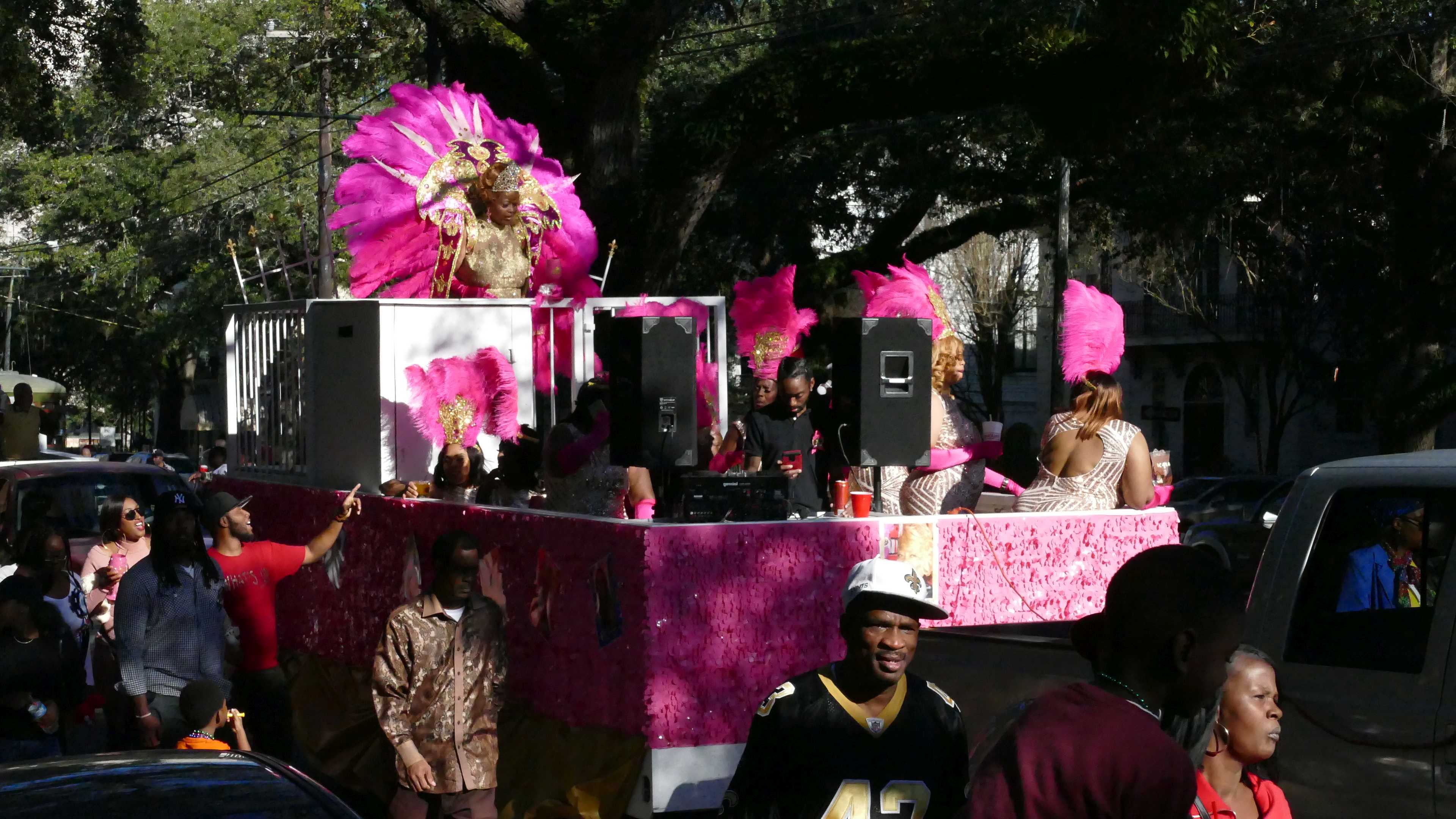 Ungefähr auf halber Strecke Richtung French Quarter, hören wir plötzlich laute Musik und ausgelassene Stimmung von vielen Menschen. Wir halten. Aus einer Seitenstraße kommt eine Karnevalsparade (Mardi Gras) mit mehreren Wagen und hunderten Menschen. Mit entsprechendem Polizeiaufgebot wird kurzerhand der Verkehr inkl. Straßenbahn lahmgelegt und ausgelassen gefeiert. Wir haben nachgefragt, um welche Parade es sich handelt. Es war keine offizielle New Orleans Parade, sondern ein von einem Stadtteil organisierter Umzug. Die Musik und das Drumherum ist jedenfalls genauso, wie man es aus Film und Fernsehen kennt. Uns hat es sehr viel Spaß gemacht, den Beteiligten beim Tanzen zuzuschauen, vor allem wie die meist sehr gut proportionierten Damen in ihren engen Stretchanzügen sich ungeniert präsentierten und mit all ihren Vorzügen das Publikum unterhalten. Auch die jüngeren üben schon kräftig am Wegrand, machen mit ihrem ausgeprägten, eng eingepackten Hinterteil akrobatische Übungen und verewigen diese gleich in Fatzebuck oder Instagramm. Wusste gar nicht, dass die Verwandtschaft der Kim Kardashian so groß ist. Jedenfalls wundern wir uns jetzt nicht mehr über deren prachtvolles Hinterteil. Frau braucht das hier.
