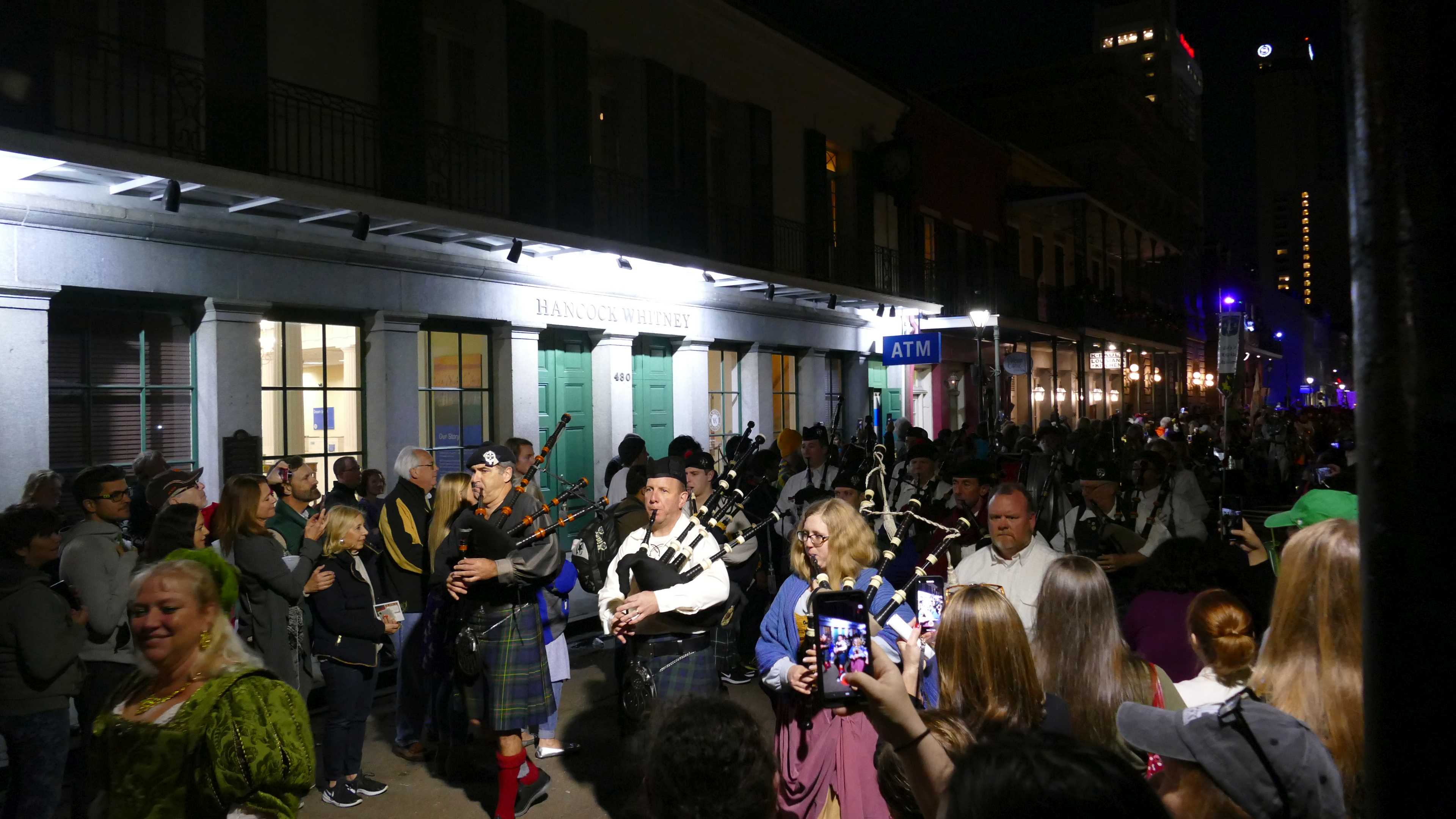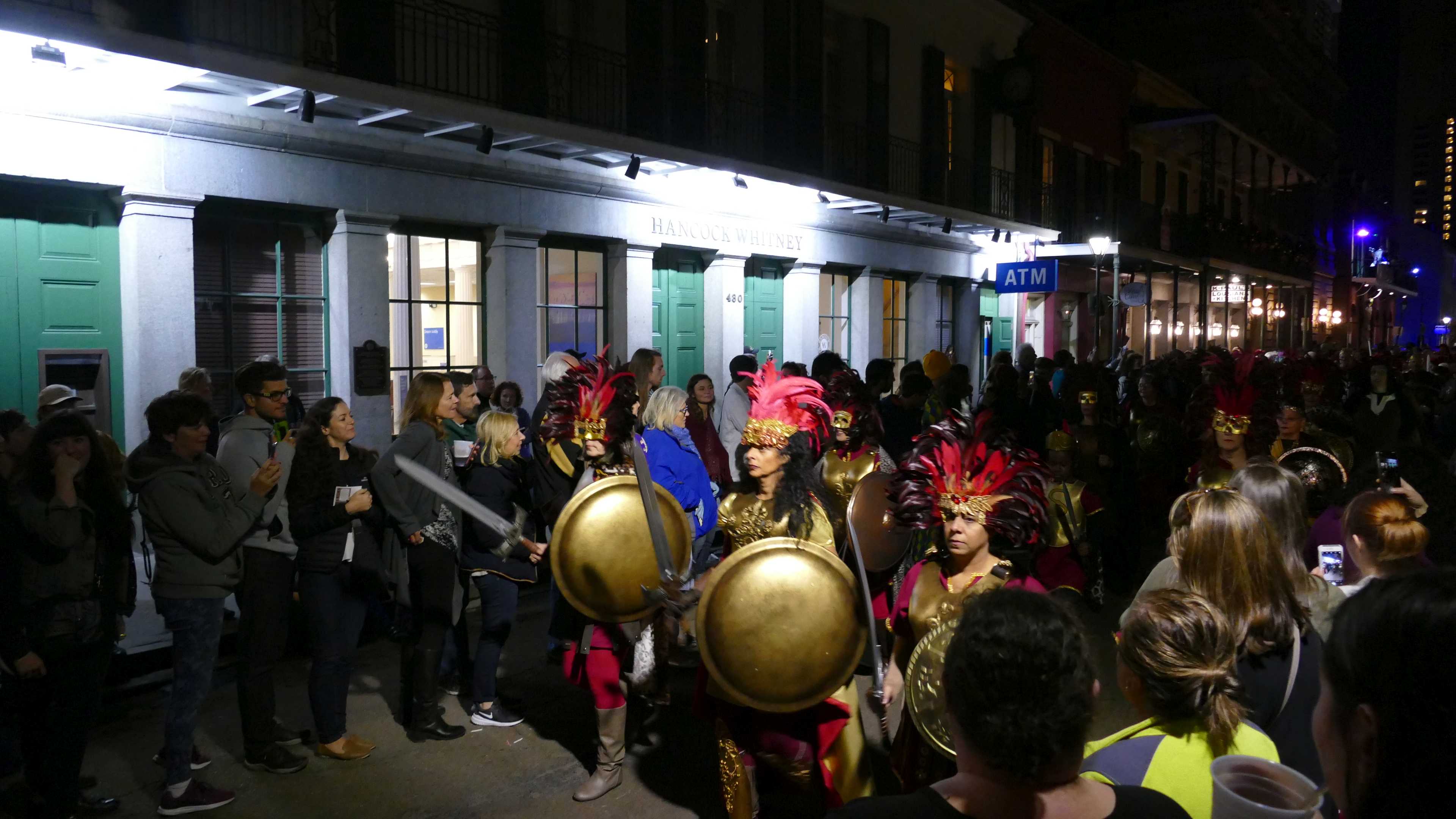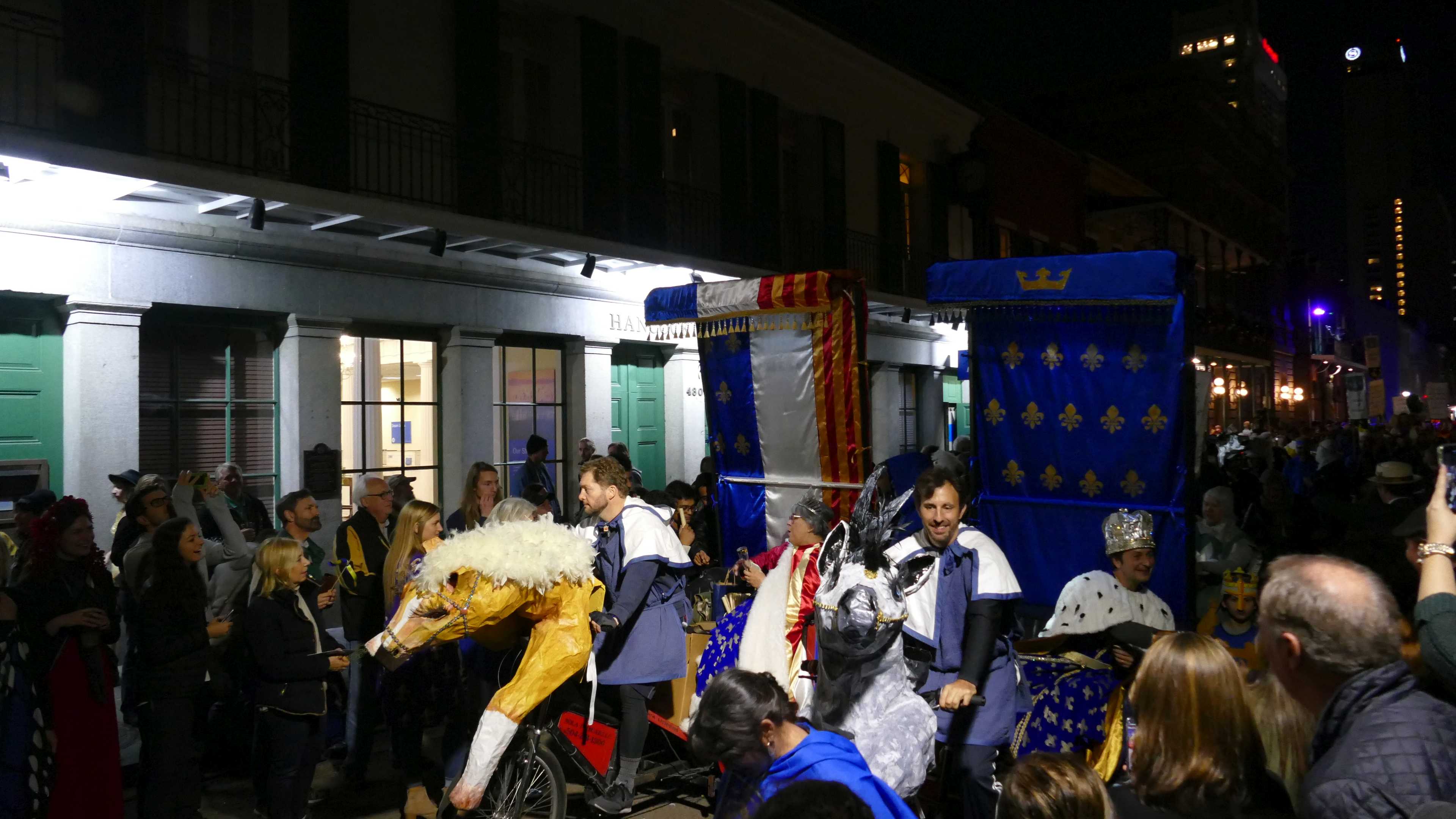 Heute Abend ist der erste offizielle Karnevalsumzug in 2019 im French Quarter und die beiden fahren mit dem Fahrrad rein. Eigentlich auch so von uns geplant, aber nachdem wir nachmittags den Umzug gesehen haben und eine Verschnaufpause jetzt nicht schlecht wäre, überlegten wir, den Umzug sausen lassen. Auf der anderen Seite, wenn man schon mal da ist... Nach einer Lichtprüfung an den Fahrrädern, funktionieren nur teilweise. Also erst mal Walmart und Zusatzbeleuchtung organisiert bevor es losgeht. Als wir im Quarter ankommen, stehen entlang der Strecke schon Hunderte Menschen und warten. Also haben wir noch nichts verpasst und müssen trotzdem noch über eine halbe Stunde warten bis endlich etwas passiert.