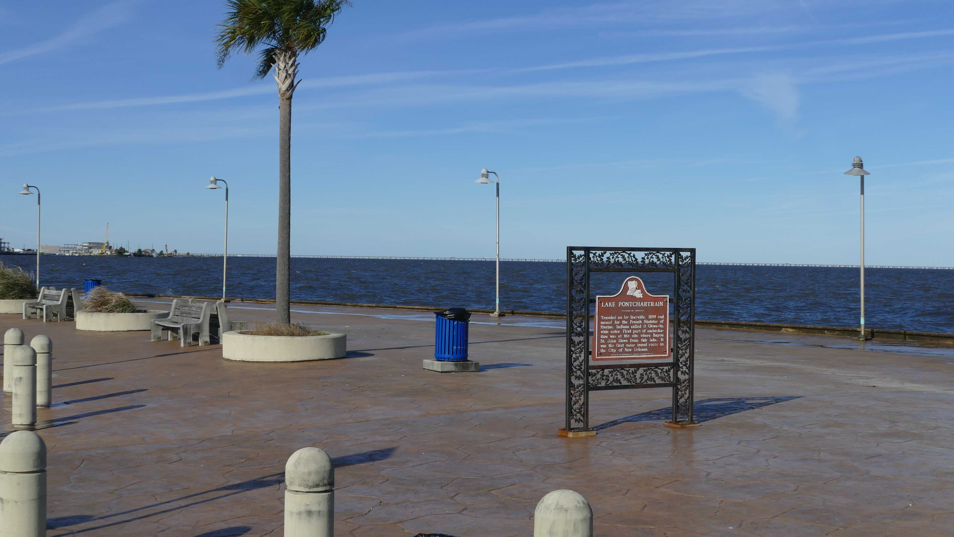 Wir fahren aus dem City Park raus und nicht weit zuerst ans Ufer des nördlich von New Orleans gelegenen Lake Pontchartrain; ungefähr die 3-4fache Größe des Bodensees. Der heute böige Wind und die aufgepeitschten Wellen am Kai - es könnte auch das Meer sein, kein Ufer in der Ferne zu erkennen. Schnell ein paar Fotos aus dem Fenster und wir biegen nach Westen ab.