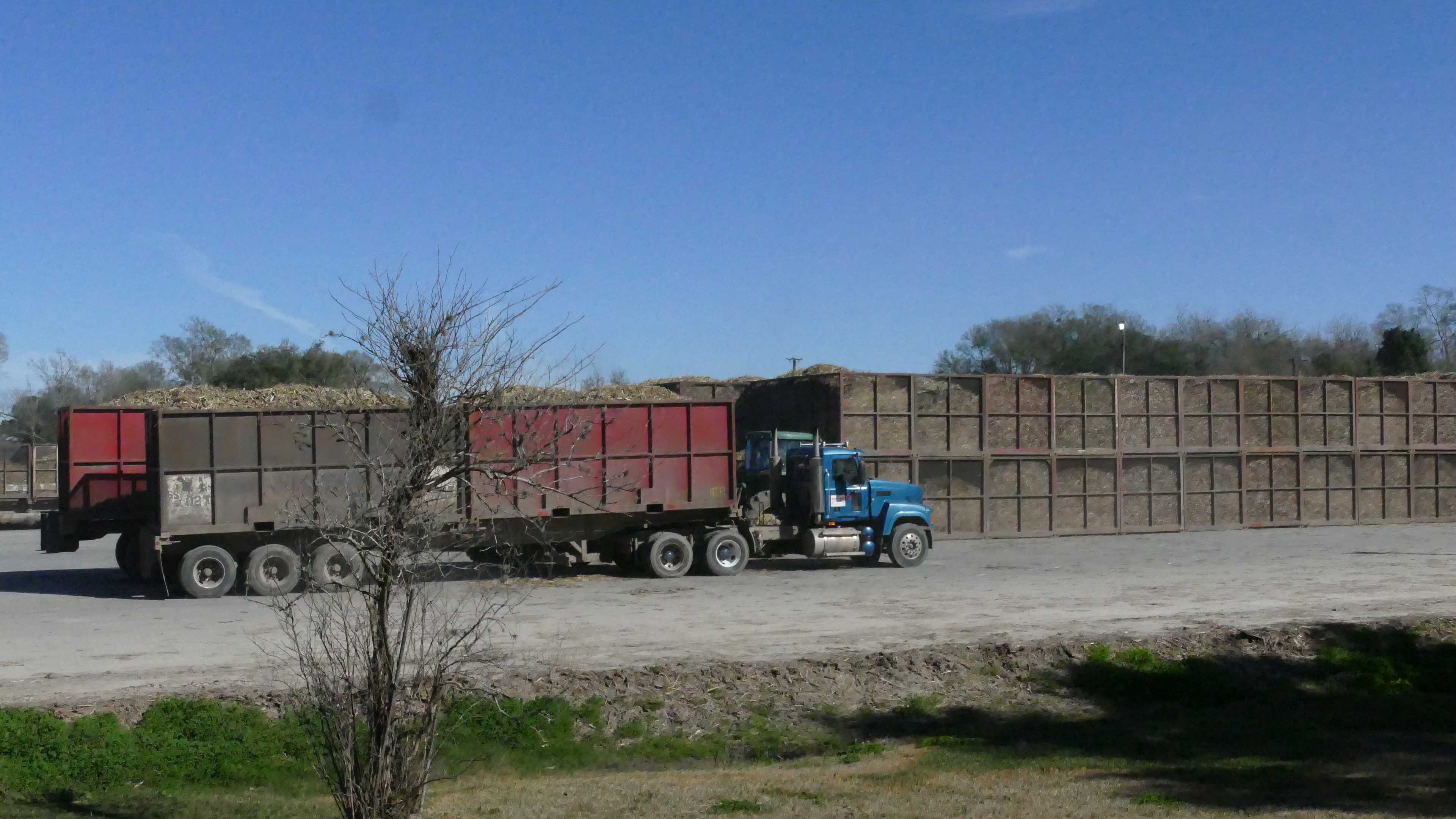 Am Ende des Städtchens steht eine große Zuckerrohrfabrik, aus vielen Schloten kräftig dampfend. Kilometerweise Felder, alle gleich bearbeitet (erhöhte Pflanzreihen wie beim Spargelanbau), komplett voll Zuckerrohr in den unterschiedlichsten Wachstumsphasen. Später erfahren wir, die Erntezeit und Verarbeitungszeit von Zuckerrohr ist beschränkt auf die Wintersaison von Oktober bis April. In dieser Zeit werden in den einzelnen Fabriken die unglaubliche Menge von mehr als 17.000 To Zuckerrohr pro Tag verarbeitet. Im gesamten Deltagebiet von Louisiana gibt es -laut Google- mehr als 20 solche Fabriken. Daran lässt sich ermessen, wie groß die Anbaufläche und die Logistik dafür ist. Egal wo wir fahren, im Abstand von Minuten kommen uns die riesigen Laster mit Zuckerrohr entgegen oder fahren leer wieder zur Ernte auf die Felder. Hier wird das Zuckerrohr wie Mais am Boden abgeschnitten, in ca. 25cm lange Stücken gehackt und direkt in die parallel fahrenden Anhänger geblasen.