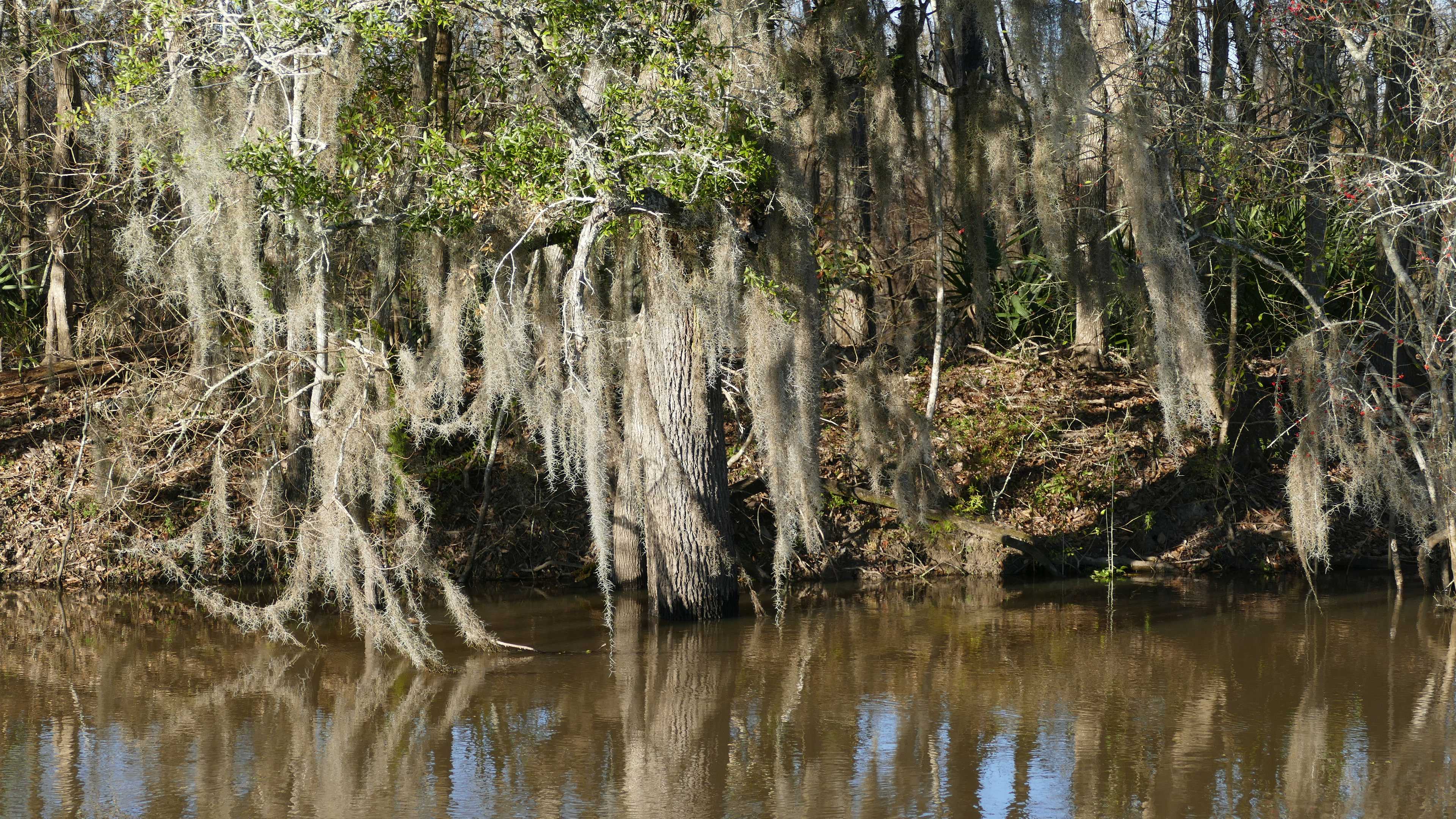 Dass wir uns in einem riesigen sumpfigen Flussdelta befinden, sehen wir u.a. an den Straßen und Autobahnen, komplett auf Betonstelzen gebaut im Brackwasser stehend. Die Sumpfzypressen sind fast vollständig mit Tillandsienbärten überzogen. Ständig müssen irgendwelche Wasserstraßen überquert werden über Hebe-Brücken oder über kleinere zum Schwenken.