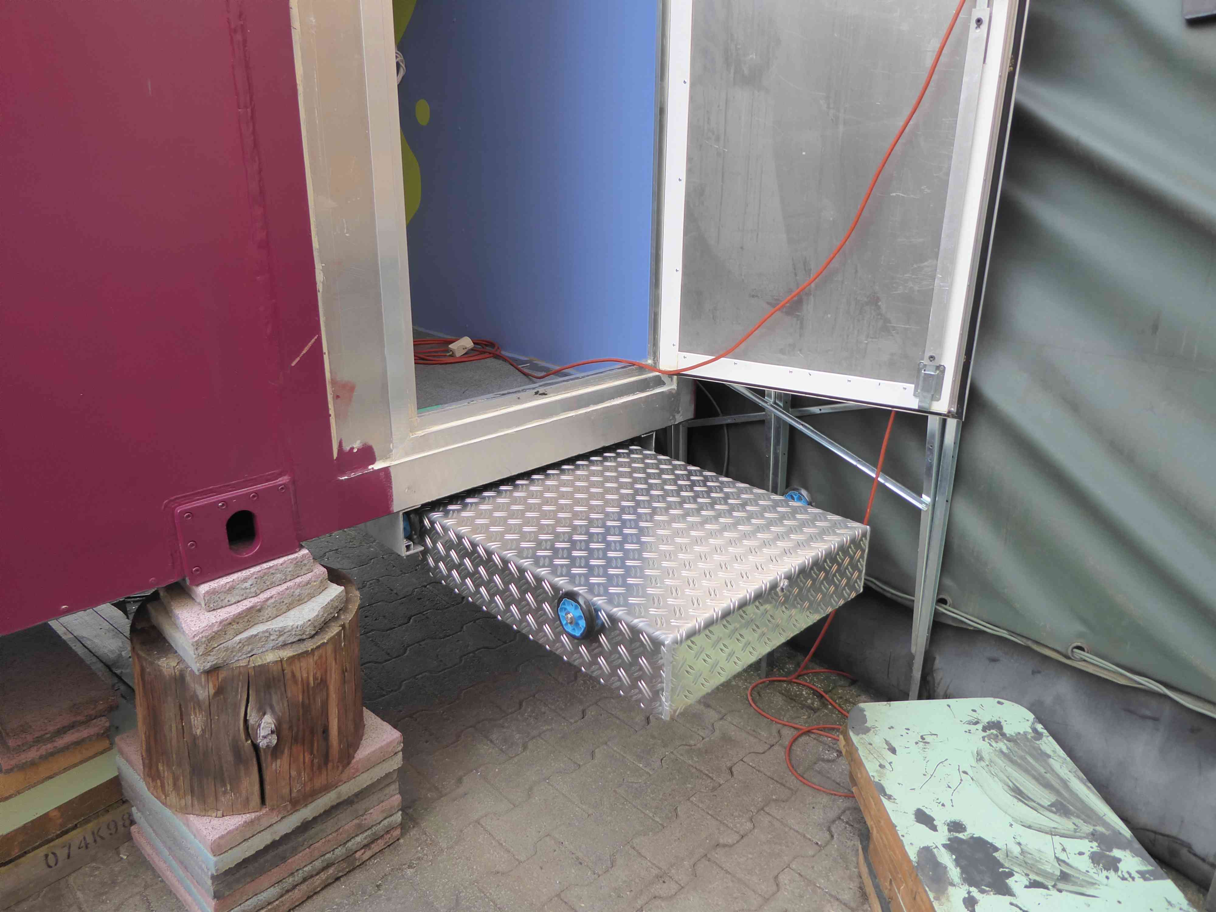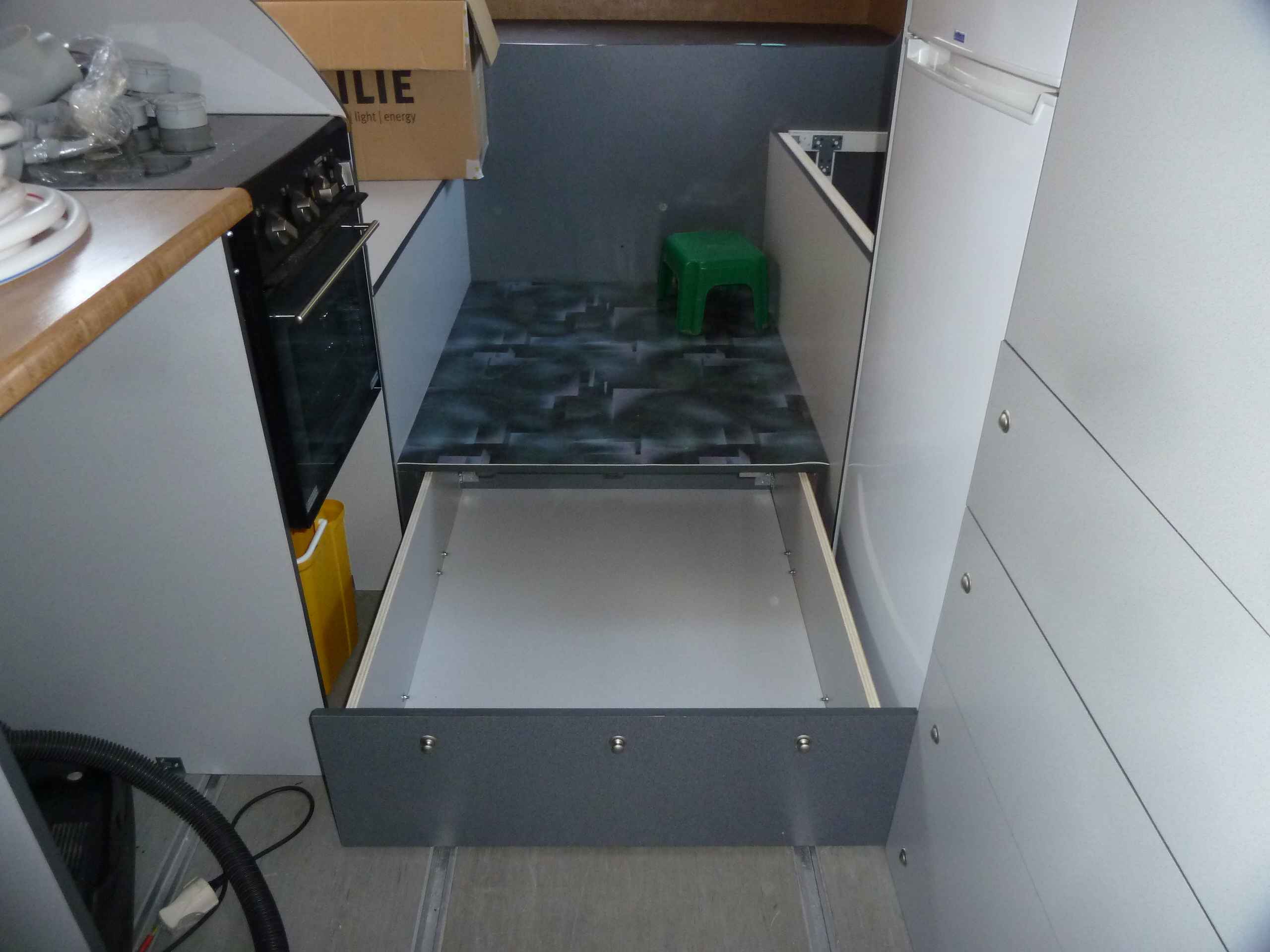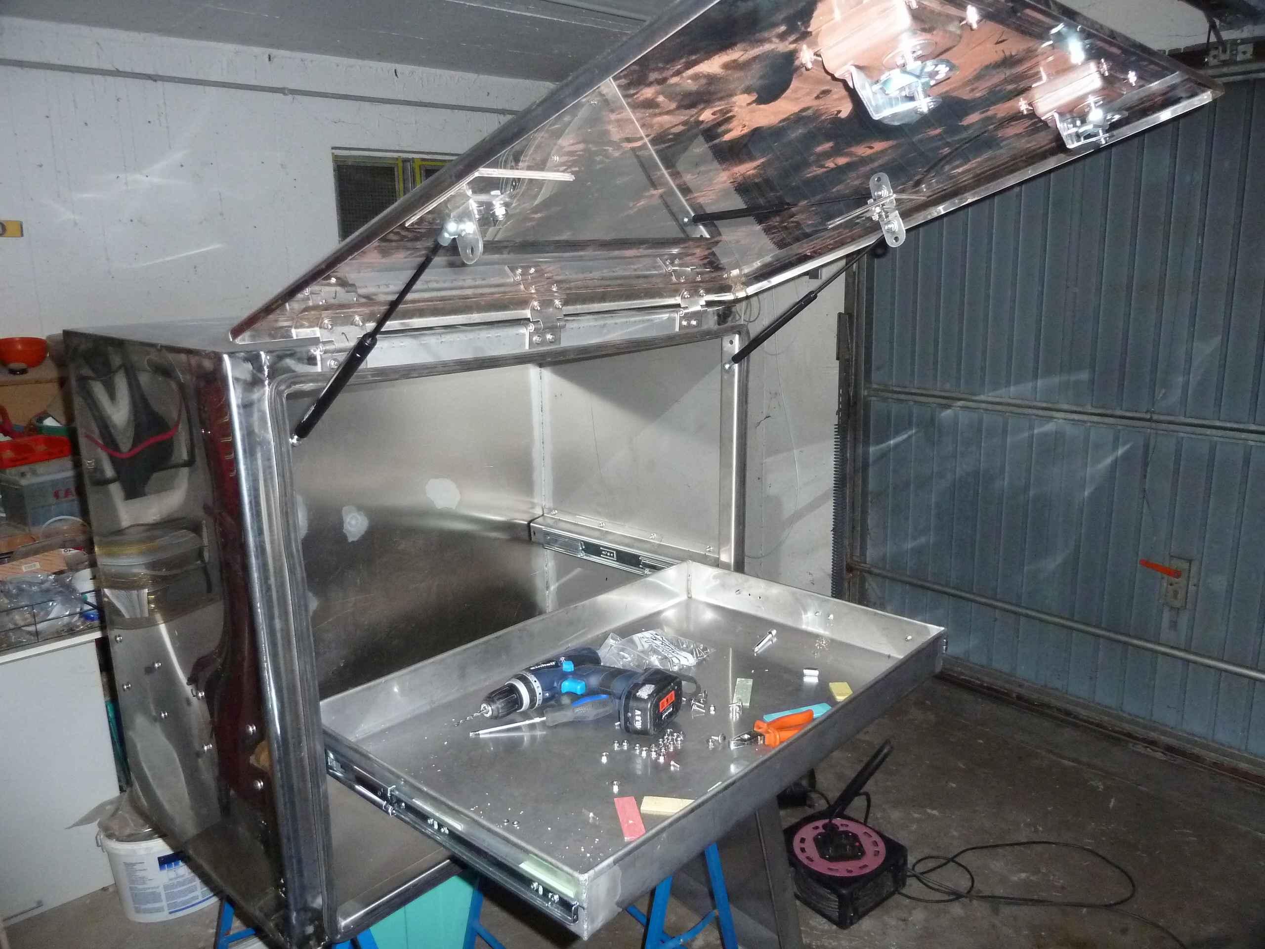 Ab April und wieder annehmbaren Temperaturen wurden die halbfertigen Edelstahlboxen (u.a. die Aussenküche) mit den passenden Schubladen versehen, was eine nicht unerhebliche Fummelei war, bis die Schubladen so funktionierten wie ich mir das vorstellte.
