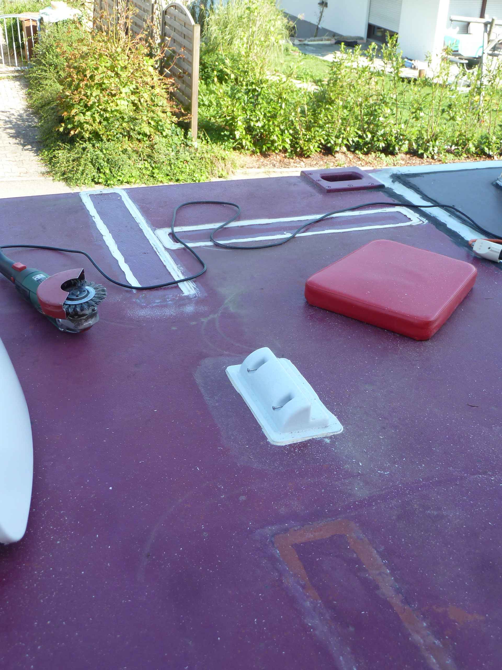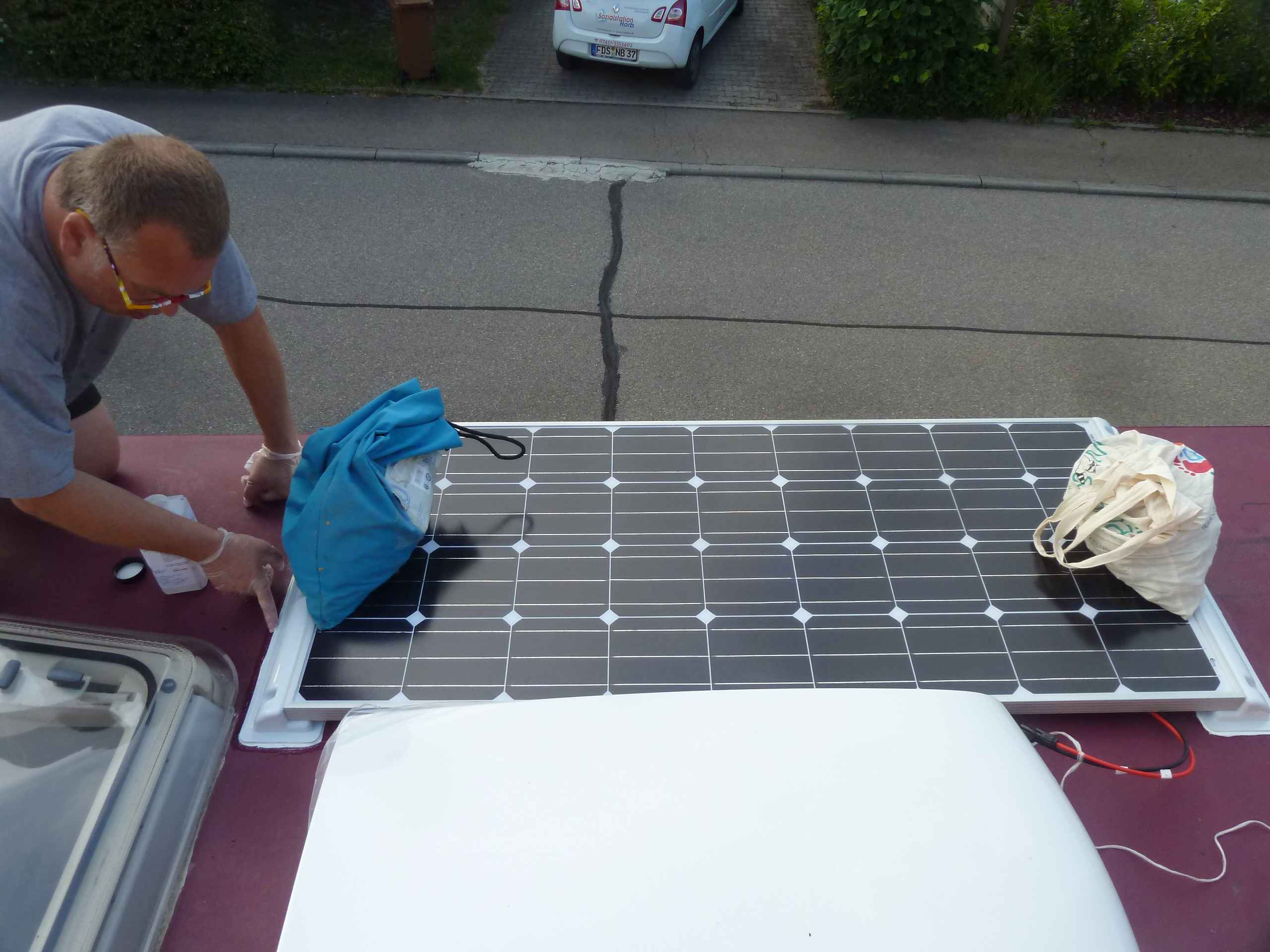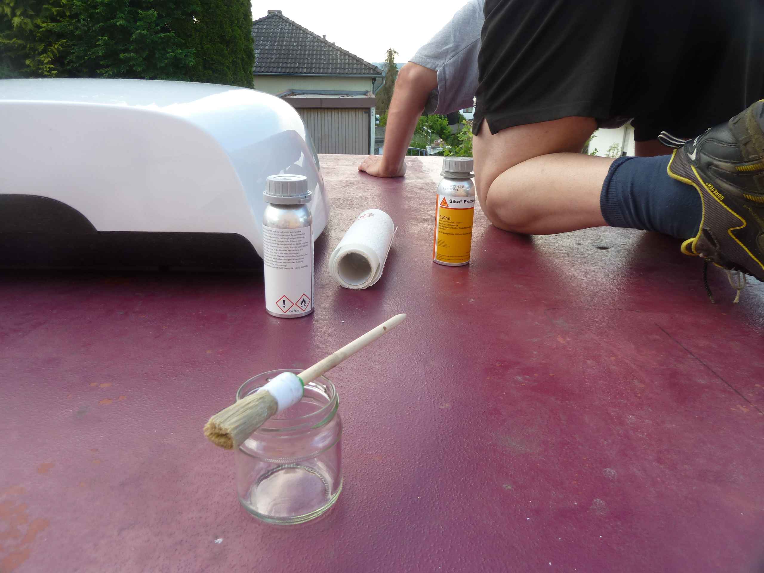 Nachdem die Konturen für die Solarpanelspoiler auf dem Dach nachgezeichnet waren, wurden die Stellen leicht angerauht und mit dem Primer von Sika vorbehandelt. Dann mit Sikaflex 252 die Auflageflächen der Spoiler versehen und an die vorgesehene Position auf dem Dach platziert. So langsam wird es auf dem Dach voll.