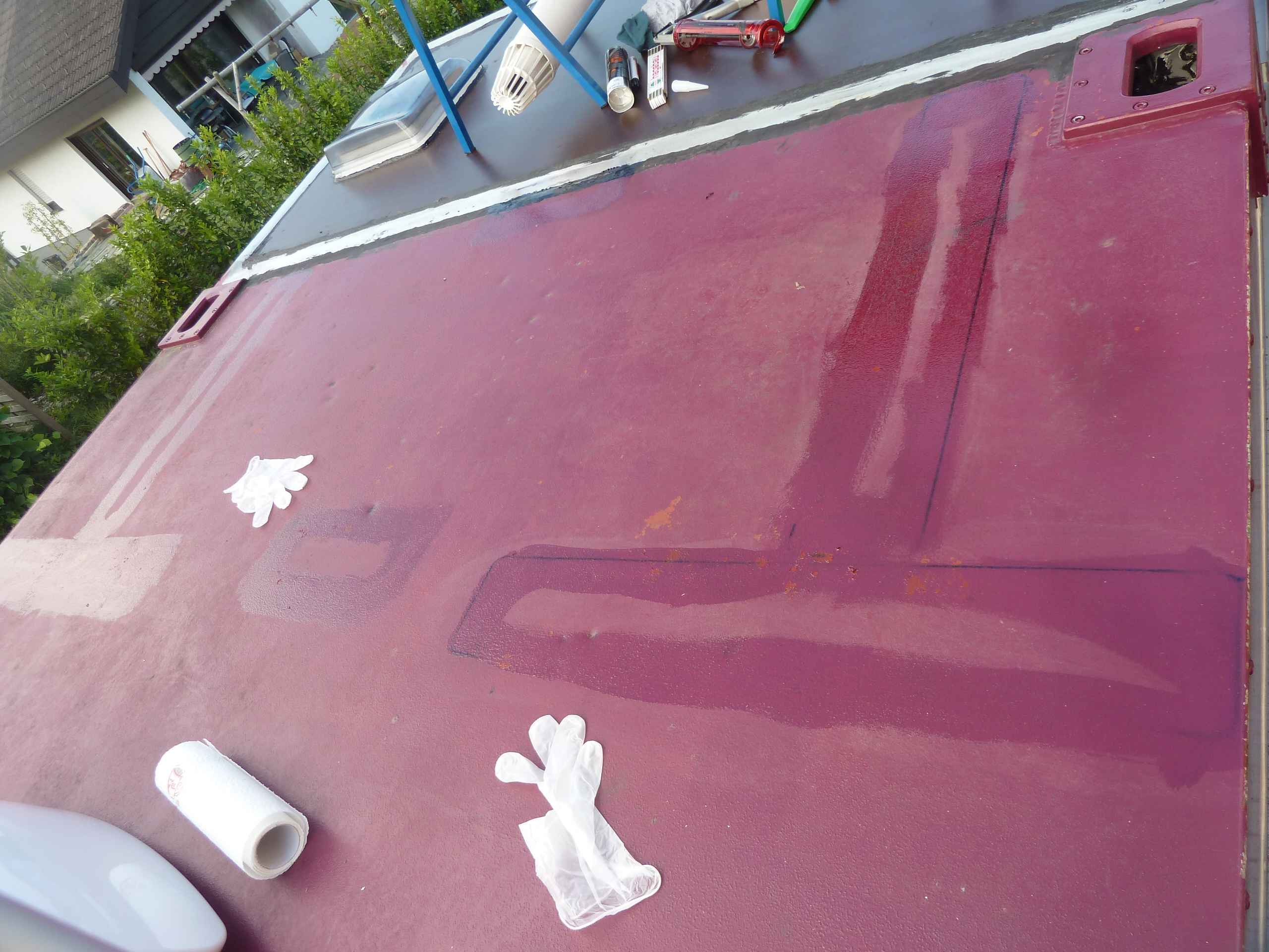 Mai 2015. Damit das Wasser nicht nach jedem Regen in der Vertiefung des Anbaudaches steht haben wir mit Sikaflex eine passend zugeschnittene Siebdruckplatte eingeklebt.