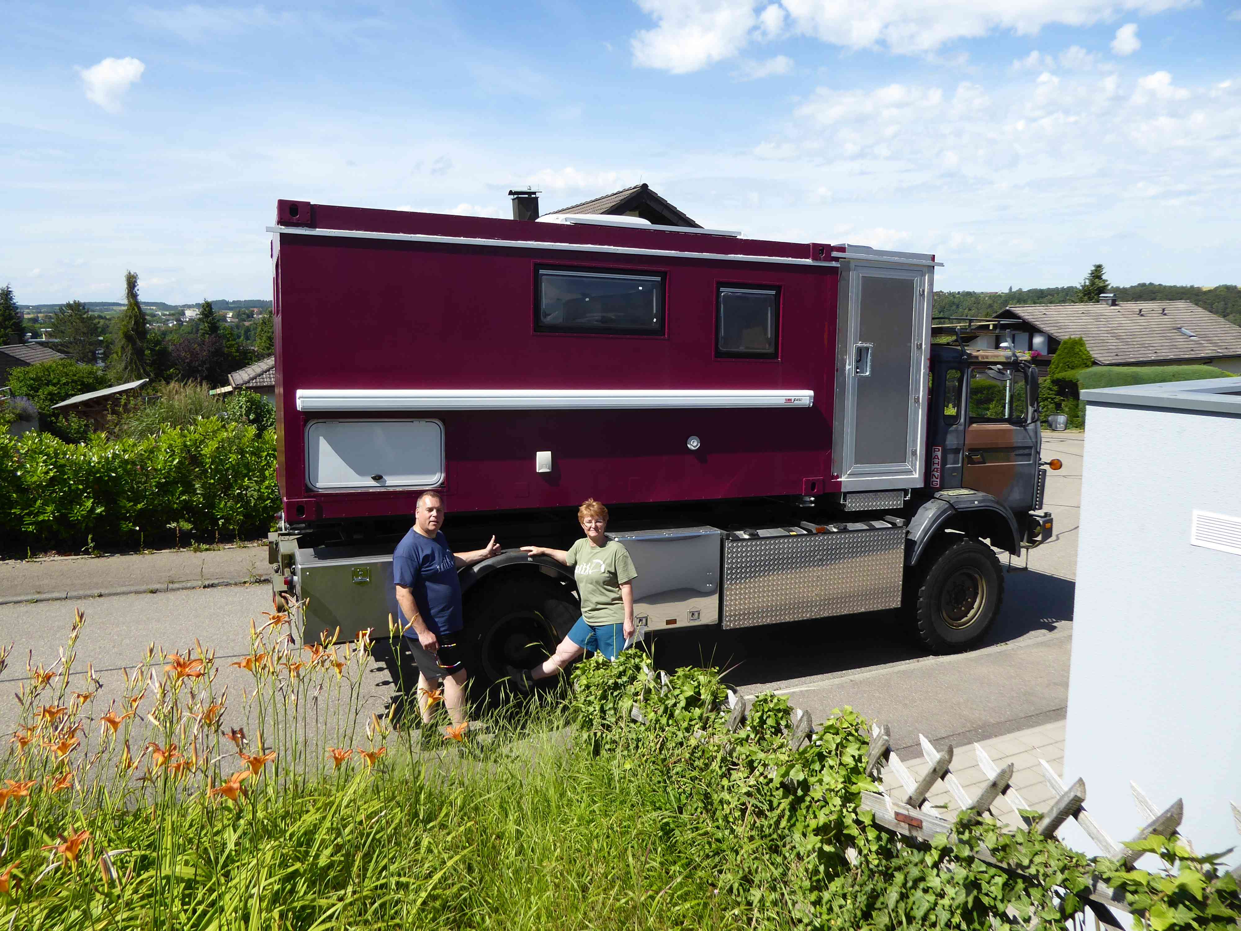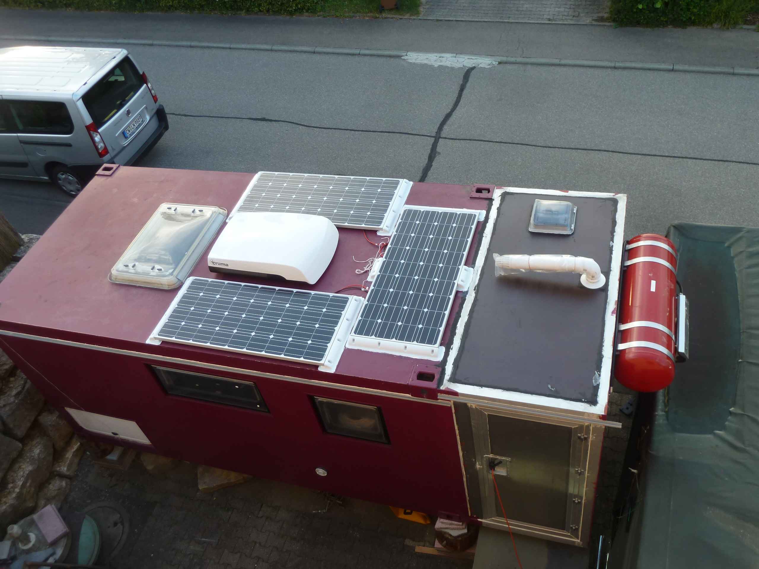 Juni 2015. Zwischendurch wurde auch im Aussenbereich weitergebastelt. Neben der korrekten Platzierung der Solarmodule (3 x 150 Wh monokristallin) von Enjoysolar wurde mal wieder ein Loch in die Aussenhülle geschnitten, damit die Klimaanlage eingebaut werden konnte.
