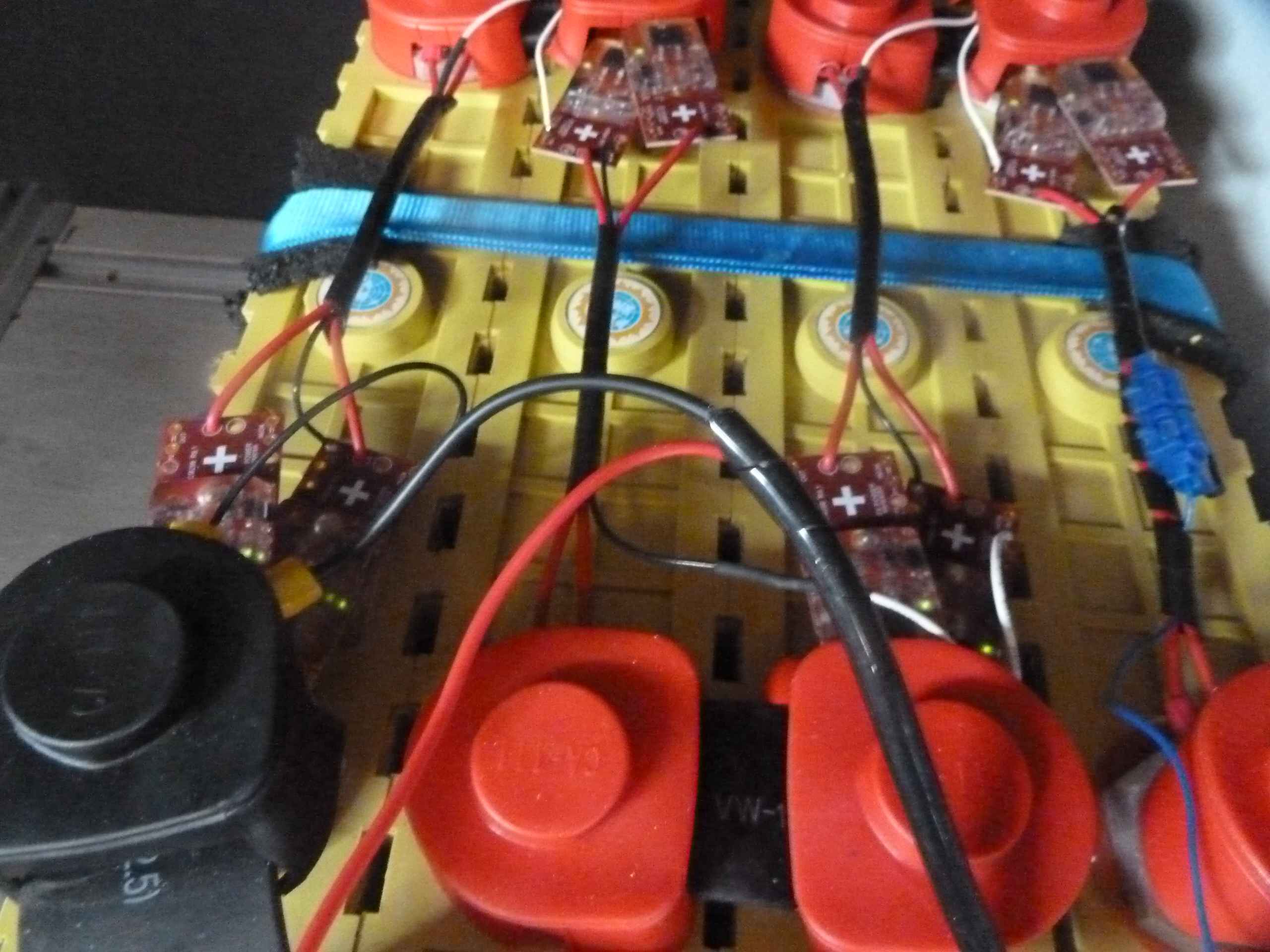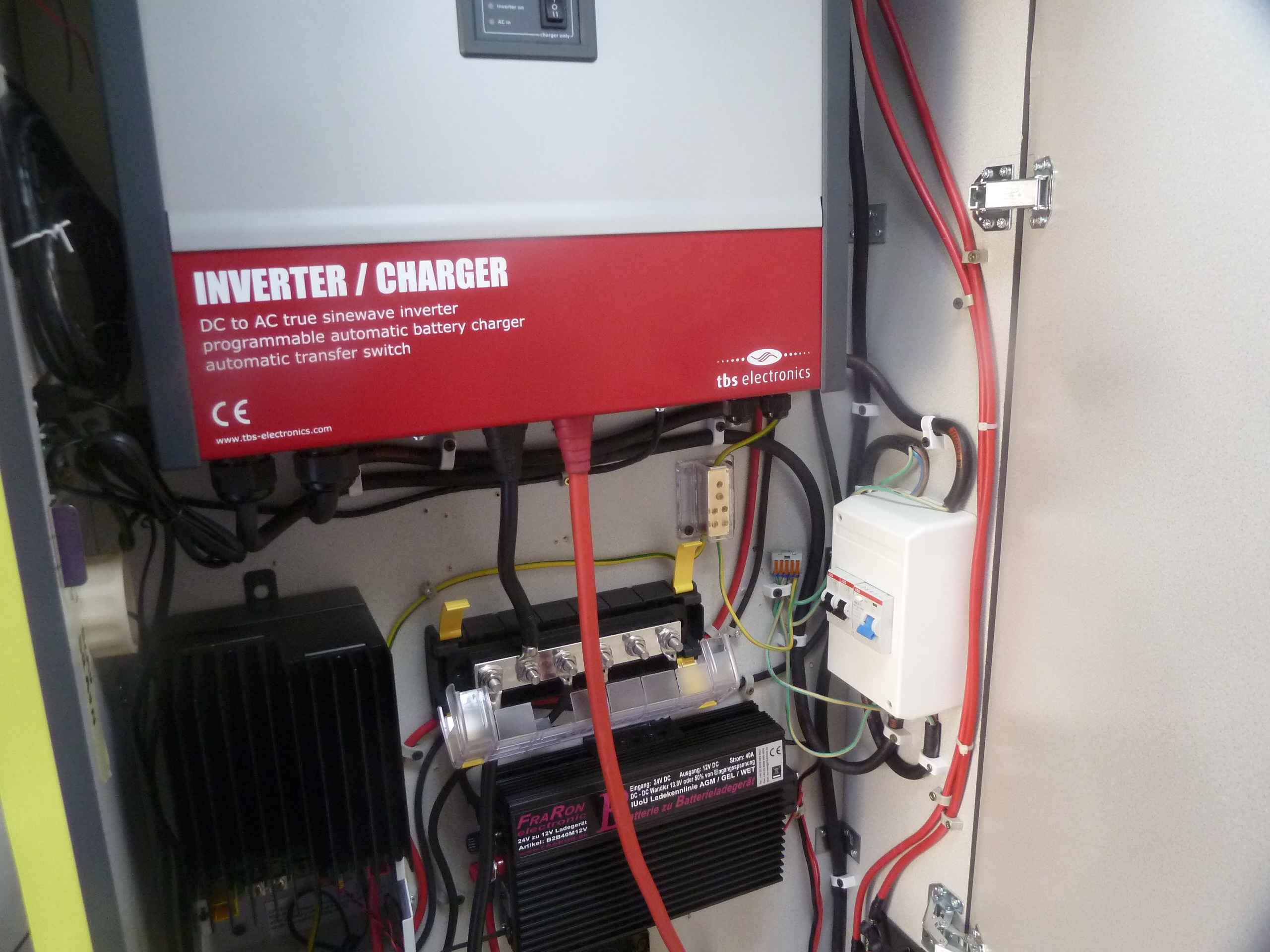 August 2015: Nach vielen Stunden Kabel crimpen und verlegen nimmt der Schaltschrank auch Form und Gestalt an. Im grossen Schrank ist komplett die Stromeingangsseite vertreten und auch die beiden Verteilerbänke für Plus und Minus, während die Stromausgangsseite mit den Sicherungen in einem seperaten Schrank untergebracht ist. Links der 230V-Sicherungskasten und rechts die 12V-Welt.