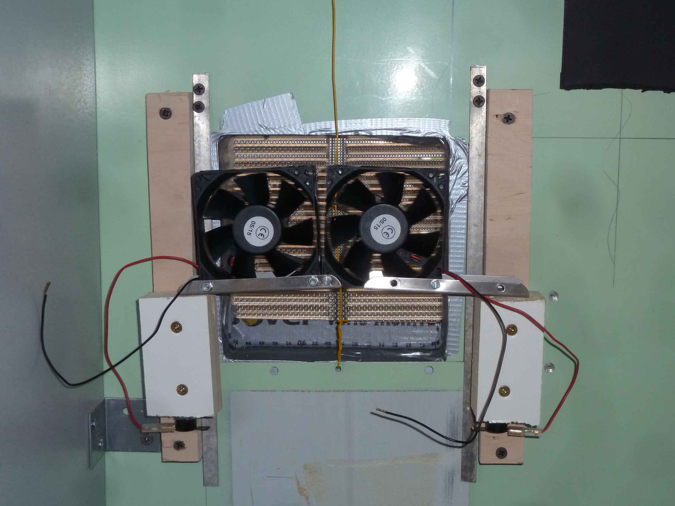 Um die Wärmeabfuhr des Kühlschranks zu optimieren wurde sowohl eine manuell einstellbare Verschlußplatte für den Winterbetrieb, als auch zwei temperaturgesteuerte Ventilatoren vor der Öffnung platziert. Der mit wetterfester Folie überzogene Kunststoffsteg soll verhindern, daß bei seitlichem Extremregen Wasser von aussen hinter dem Kühlschrank eindringen kann.