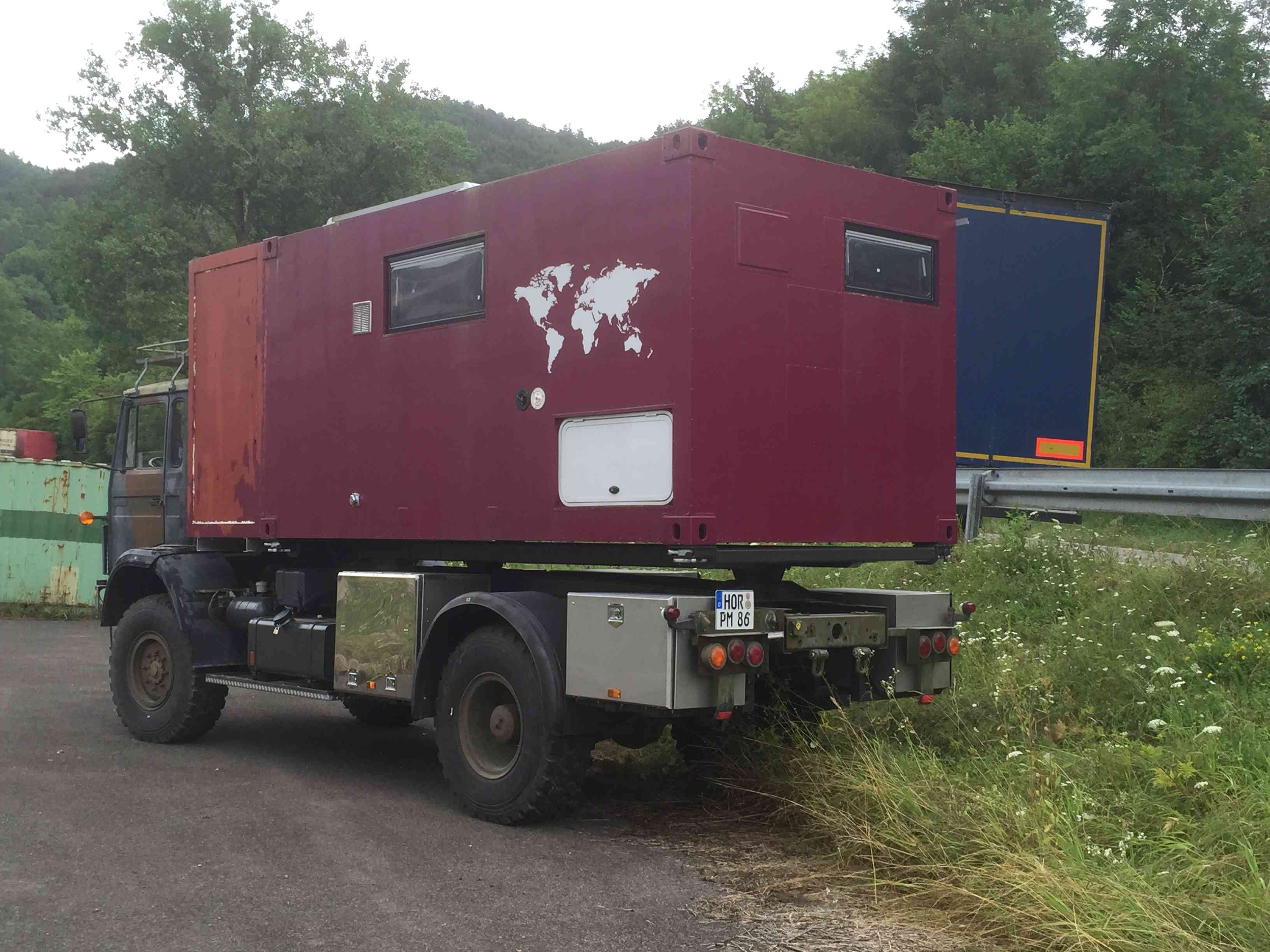 Die Dämmerung bzw. Nacht bricht im September immer früher herein und deshalb wird ein Teil der Arbeit bei Zusatzbeleuchtung erledigt. Die beleuchtete Garage hat einen stachligen Besucher neugierig gemacht. Nachdem alle Stauraumklappen installiert sind, wurden sie noch zusätzlich mit Öffnungshaltern versehen. Ein sehr unerfreuliches Kapitel war, daß die Halterungen der Solarpanels sich nicht optimal mit dem Sikaflex verbunden haben, trotz aufgebrachten Primer. Nachdem wir mühsam mit der Flex-Drahtbürste den kompletten Kleber entfernt hatten, rauhten wir auch die Kunststoffhalter der Panels mit einem groben Schleifpapier an, damit der Primer und Sikaflex einen deutlichen bessere Oberfläche vorfinden. Jetzt hälts. Im Innenraum hat der Kleiderschrank noch eine Türe und 2 Fächer bekommen.
